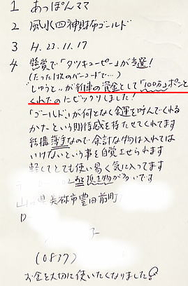 [42]映画の券の当選をきっかけに、図書カード1000円5回 、ギフト図書券、ローストビーフなど次々に懸賞が当たる。