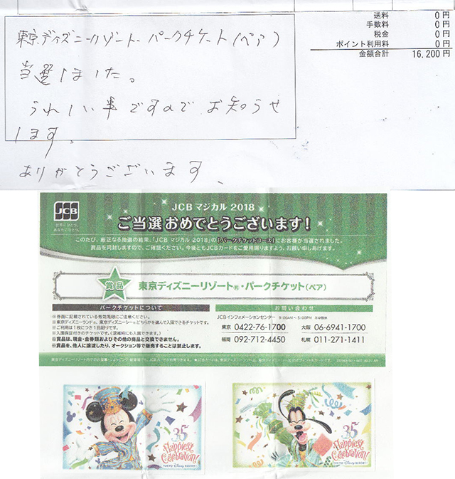 [180]東京ディズニーリゾートパークチケット(ペア)に当選しました。