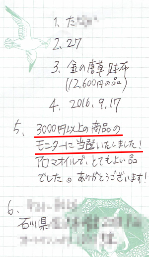 3,000円以上の商品のモニターに当選しました!