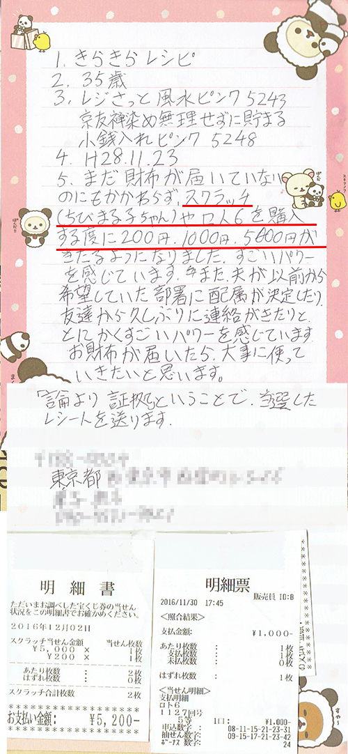 1ヶ月以内に色々な方からプレゼントを貰ったり、スクラッチで5,000円、宝くじでも3,000円など当選続きです!