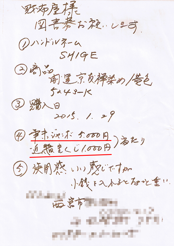 商品到着の翌日にお義父さまから商品券1万5千円分をもらった。