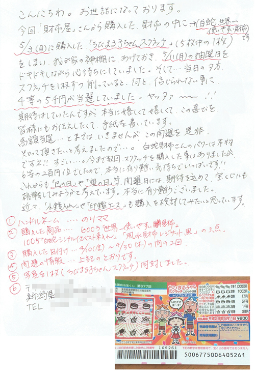 スクラッチ(ちびまるこちゃん)で5000円に当選!