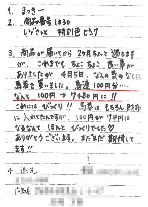 [133]1ヶ月以内に色々な方からプレゼントを貰ったり、スクラッチで5,000円、宝くじでも3,000円など当選続きです!